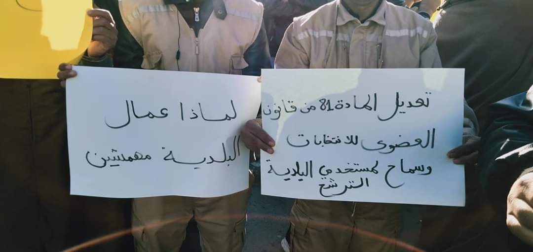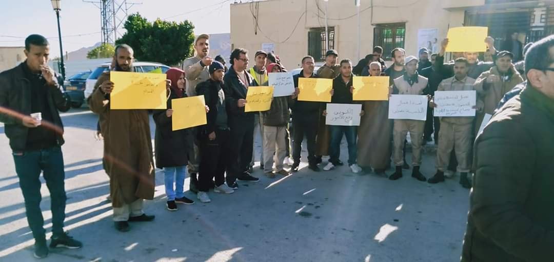 وقفة احتجاجية لعمال و موظفي المصالح البلدية مرفوقين بسلك عقود ما قبل التشغيل أمام مقر البلدية للمطالبة بحقوقهم مثل رفع الأجور و تحسين ظروف العمل و الرفع من قيمة النقطة الاستدلالية مثلما هو جاري العمل به بالنسبة للقطاعات الأخرى .