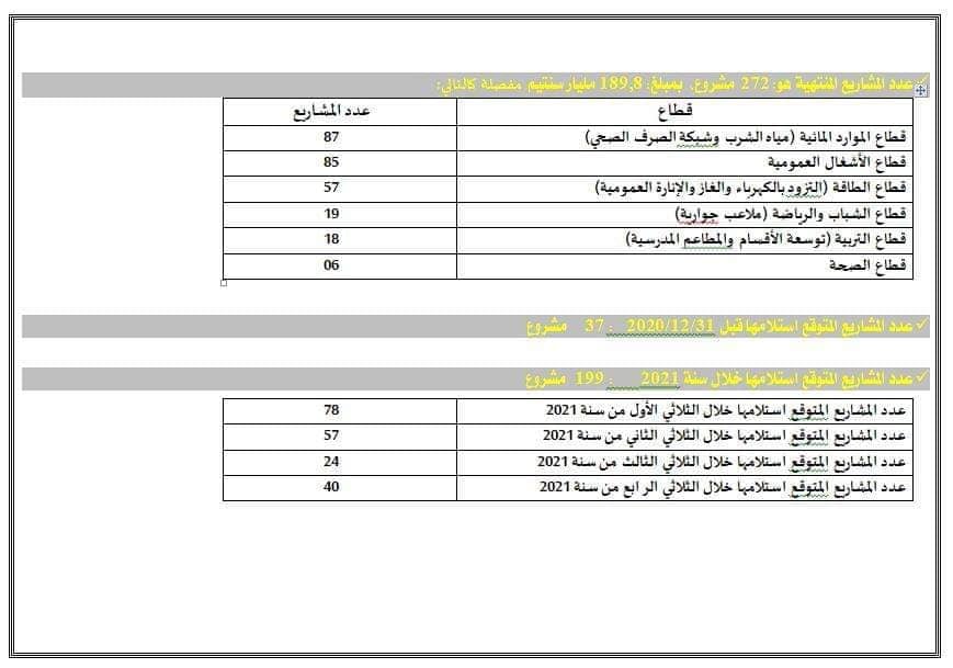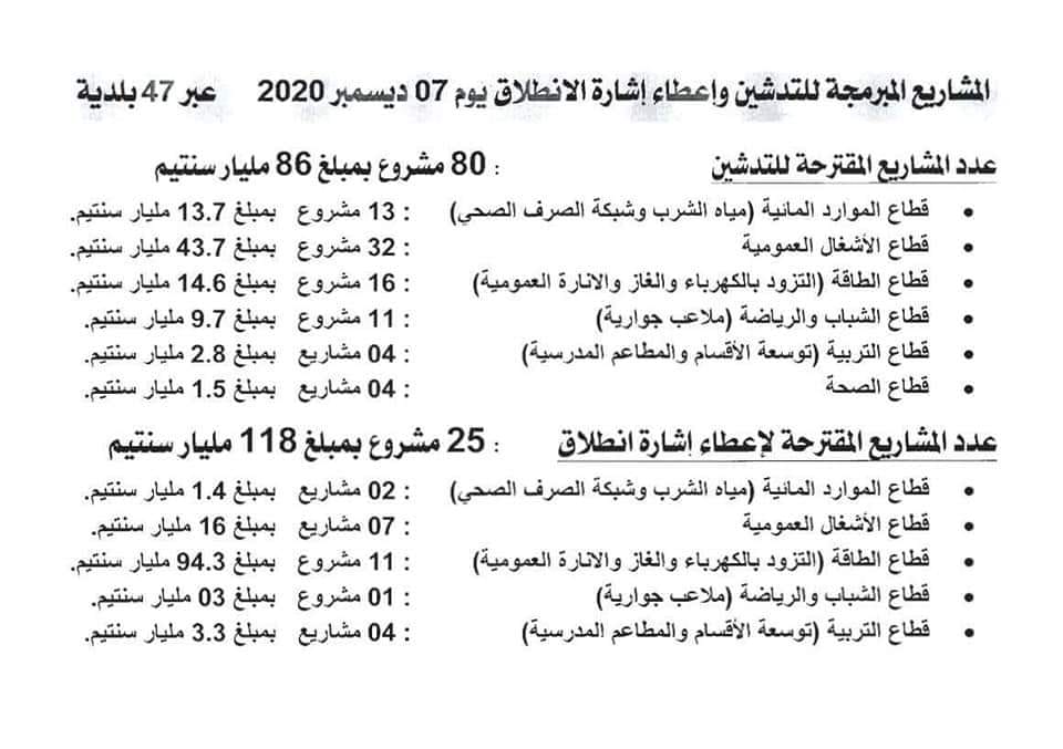 بعد توجيهات رئيس الجمهورية خلال لقاء الحكومة وتنفيذ لتعليمات وزير الداخلية وتحسين الظروف المعيشية لمناظق الظل والمقدرة ب 706 منظقة مع برنامج تسجيل لفائدتها في جميع القطاعات سيتم تدشين 78 مشروع واعطاء اشارة 25 مشروع عبر جميع بلديات الولاية