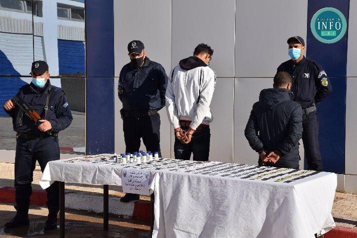 العملية تمت بناء على معلومات وتحريات معمقة تم تحديد المشتبه فيهم وتوقيفهم في حالة تلبس وبحوزتهم 1292من المؤثرات العقلية كانوا بصدد ترويجها ويتعلق الامر بشخصين مسبوقين قضائيا تتراوح اعمارهم بين 30 و 35 سنة ومبلغ مالي قدره 7500 دج من عائدات المتاجرة بهذه الحبوب المهلوسة ..