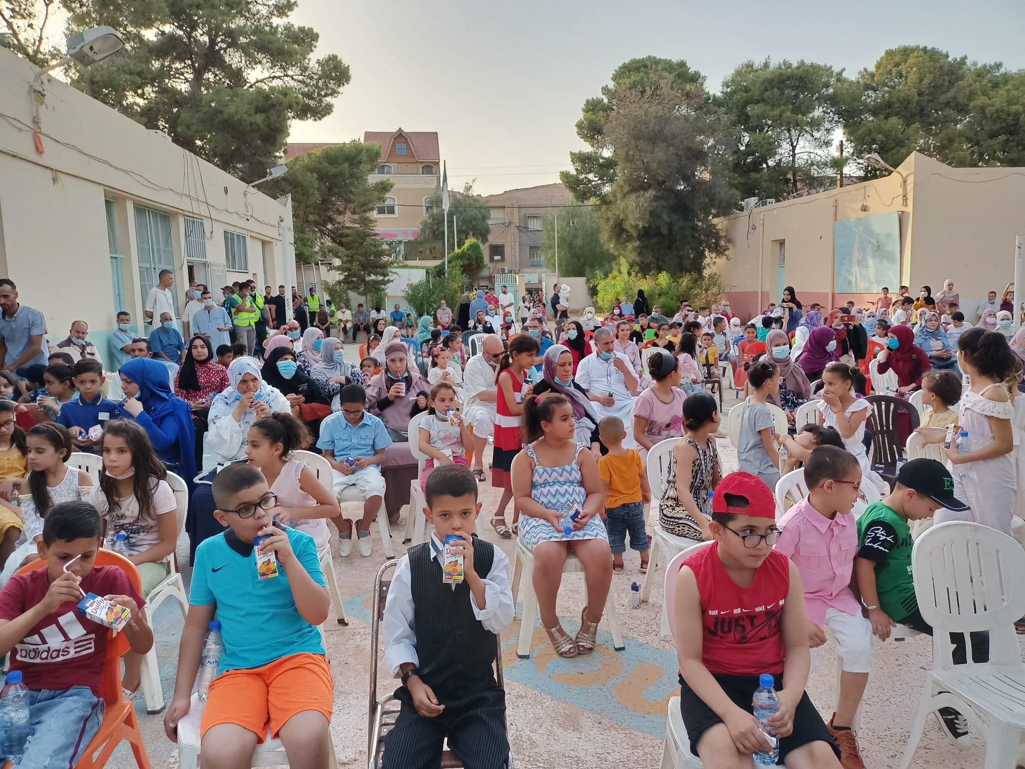 الحفل نشطه مدرس اللغة الانجليزية ومنشط الاطفال بينينو والفوكاهي ززقاد عبد الصمد حضره أولياء وعائلات التلميذ وبعض الاساتذة والضيوف تتخلل ذلك توزيع الشهادات على المتوفقين في الدراسة وعروض دراسية وحلويات ومشروبات