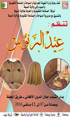 عائشة طاغابو الوزيرة المنتدبة والمكلفة بالصناعات التقليدية تفتتح عيد البرنوس ببوسعادة في اخبار بوسعادة ( فيديو ), اخبارنا في صور أفتتاح عيد البرنوس بدار الشباب جمال الدين ألآفغاني ببوسعادة تغطية موقع بوسعادة أنفو في أنتظار تجهيز الفيديو الخاص بزيارة الوزيرة عائشة طاغابو التى دشنت عيد البرنوس ببوسعادة والمقام بدار الشباب جمال الدين ألآفغاني 2016-01-07 كل الاراء تعبر عن أصحابها ولا تعبر عن موقعنا tweet