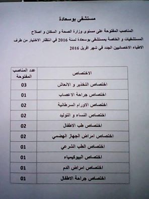 استفادت مدينة بوسعادة ببعض الاخصائين الجدد الذين سيلتحقون ابتداء من افريل القادم على مستوى مستشفى رزيق البشير بوسعادة في اطار المناصب التي فتحتها وزارة الصحة والسكان واصلاح المستشفيات لسنة 2016 والتي سوف تعطي تغطية واضافة صحية لمدينة بوسعادة وماجاورها ..
