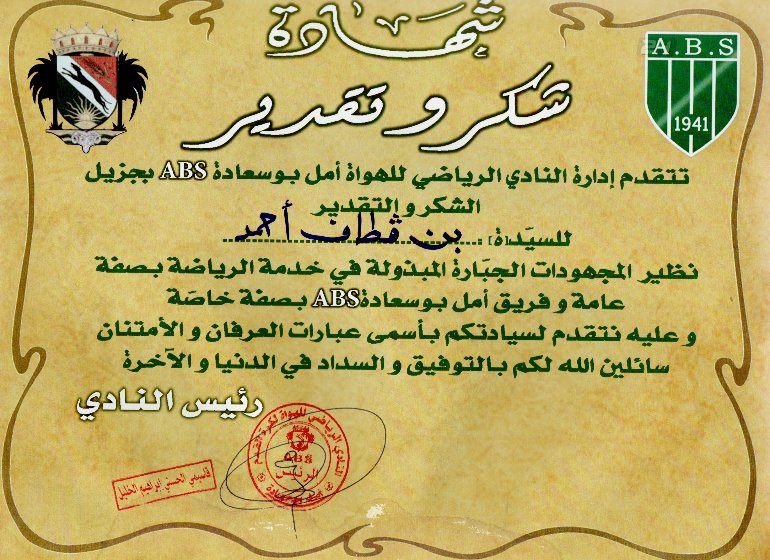“تتقدم إدارة النادي الرياضي للهواة أمل بوسعادة ABS بجزيل الشكر والتقدير للسيدة: بن قطاف أحمد، نظير الجهود الجبارة المبذولة في خدمة الرياضة بصفة عامة وفريق أمل بوسعادة ABS بصفة خاصة.