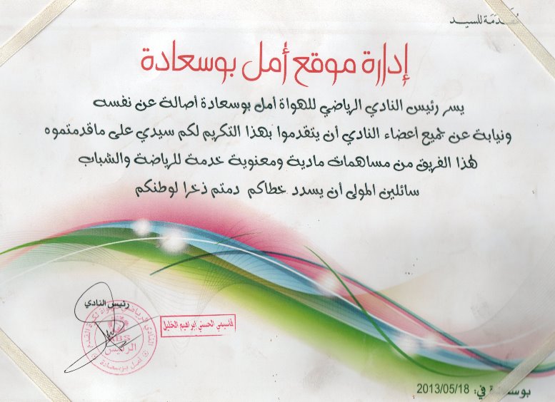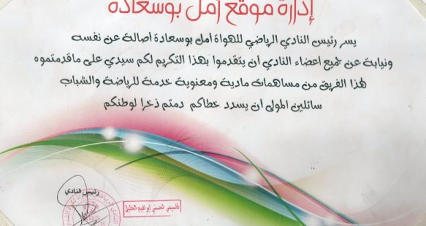 “يسرّ رئيس النادي الرياضي للهوّاة أمل بوسعادة أصالة عن نفسه ونيابة عن جميع أعضاء النادي أن يتقدّم بهذا التكريم إلى إدارة موقع أمل بوسعادة، تقديرًا لما قدمته من مساهمات مادية ومعنوية في خدمة الرياضة والشباب، سائلين المولى أن يسدّد خطاكم ويديمكم ذخراً للوطن.”