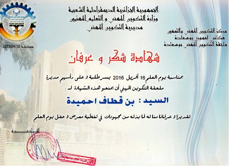 بمناسبة يوم العلم المصادف لـ16 أفريل 2016، نظّم مركز التكوين المهني والتمهين مففتاح لعموري ببوسعادة حفلاً مميزًا احتفاءً بهذه المناسبة الوطنية الغالية، شهد تكريم عدد من الإطارات والمساهمين في إنجاح الأنشطة التربوية والتكوينية.