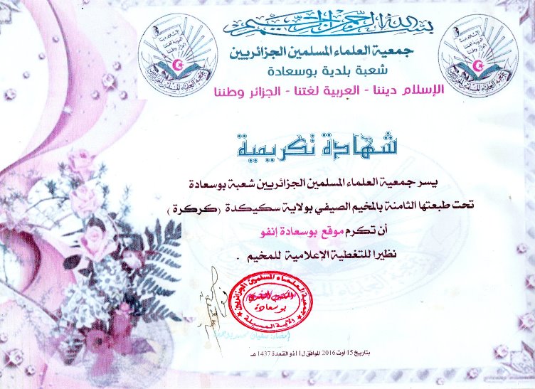 “يسر جمعية العلماء المسلمين الجزائريين شعبة بوسعادة تحت شعار الإسلام ديننا، العربية لغتنا، الجزائر وطننا، أن تكرم موقع بوسعادة أنفو نظير التغطية الإعلامية للمخيم.”