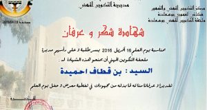 وقد تمّ تسليم الشهادة خلال فعاليات المخيم الصيفي الذي نظمته الجمعية بتاريخ 15 أوت 2016 الموافق لـ 11 ذو القعدة 1437هـ بولاية سكيكدة .
