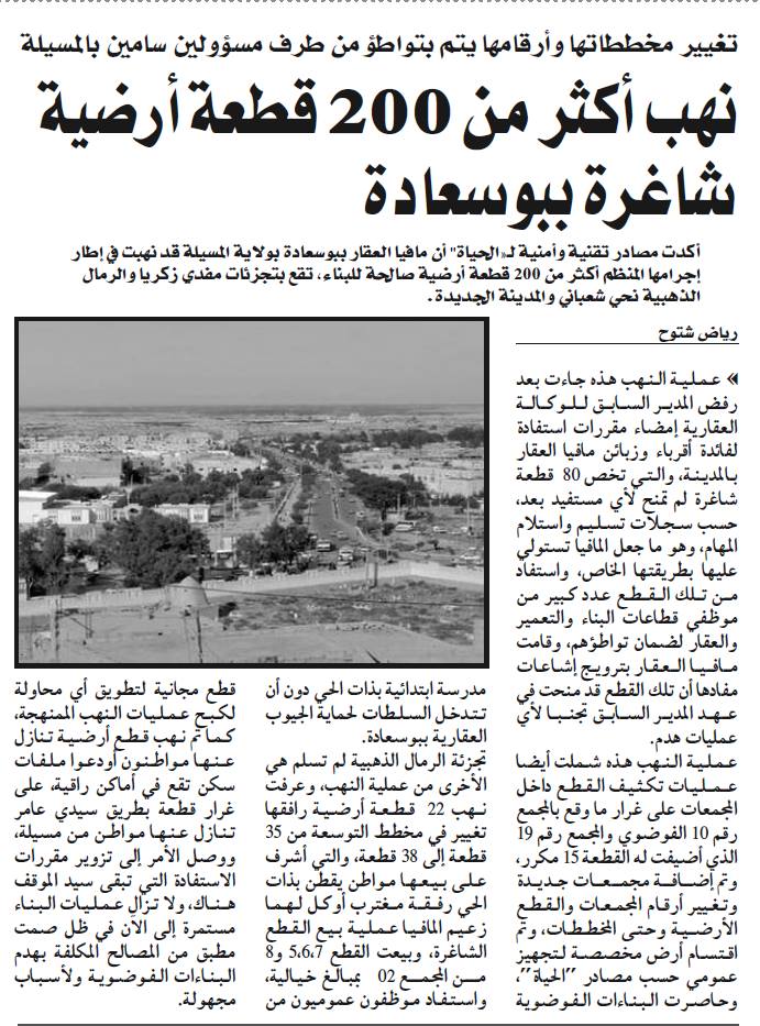 أكدت مصادر تقنية وأمنية لـ”لحياة” أن مافيا العقار ببوسعادة بولاية المسيلة قد نهبت في إطار إجرامها المنظم أكثر من 200 قطعة أرضية صالحة للبناء تقع بتجزئات مفدي زكريا والرمال الذهبية نحي شعباني والمدينة الجديدة.