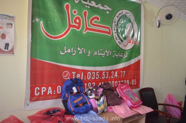اطلقت جمعية كافل لرعاية الايتام والارامل ببوسعادة حملتها في توزيع الادوات المدرسية والالبسة على الايتام التابعين للجمعية وهي مبادرة تدخل في أطار الاعمال الخيرية الكثيرة التى تقوم بها الجمعية في مساعدة أبناء الايتام وابناءالارامل بحضور رئيسها الحاج احمد القاسيمي