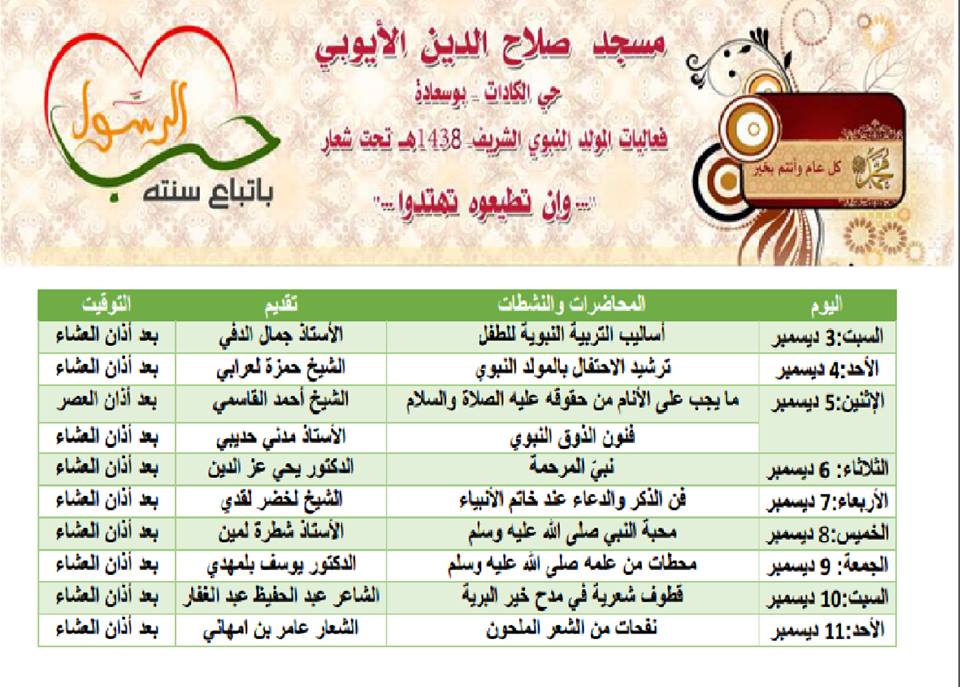 دعوة الى حضور نشاطات بمناسبة المولد بمسجد صلاح الدين لكدات بوسعادة في إعلانات محلية مسجد صلاح الدين يتألق بتنظيمه لفعاليات المولد النبوي الشريف، محاضرات وقصائد شعرية في مدح خير البرية، كونوا حاضرين ؛حتى تكونوا مأجورين . 2016-12-02 كل الاراء تعبر عن أصحابها ولا تعبر عن موقعنا tweet