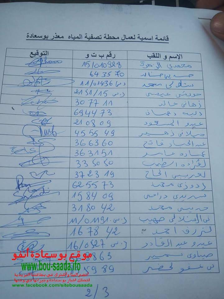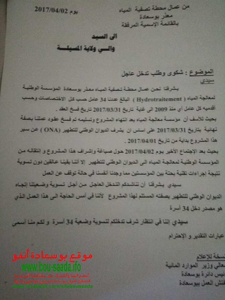 عمال محطة تصفية المياة معذر بوسعادة في رسالة الى والى ولاية المسيلة