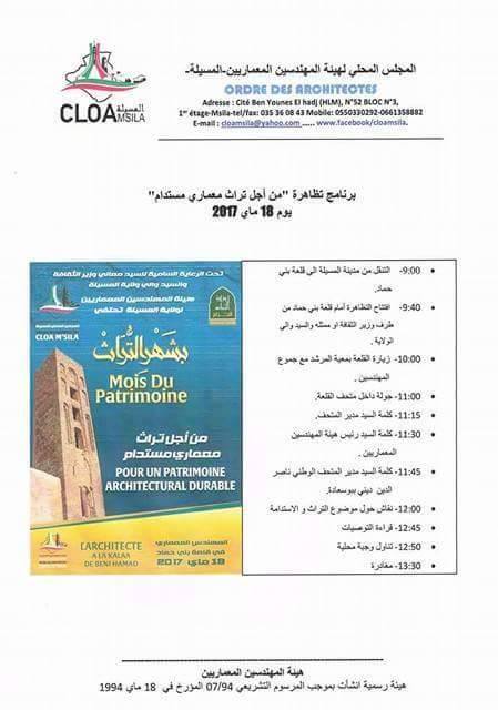 برعاية من وزارة الثقافة وتحت عنوان من ”اجل تراث معماري مستدام” نظم اليوم المجلس المحلي لهيئة المهندسين المعماريين لولاية المسيلة تظاهرة تظم عدة نشاطات تهتم بالتراث المعماري و فن الهندسة والبناء، حيث يشارك فيها اهل الاختصاص.ذلك بالموقع الاثري ”قلعة بني حماد” التي اختيرت كونها تزخربمميزات عمرانية كالحفريات والمنارة و القصور من العصر القديم،وبحضورمهندسين معماريين من داخل و خارج الولاية.