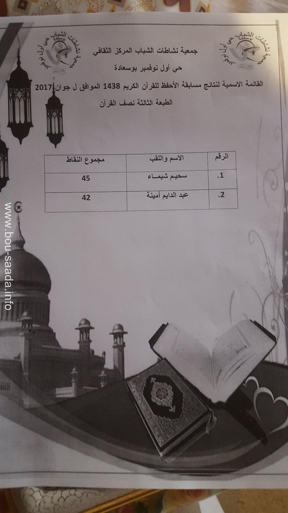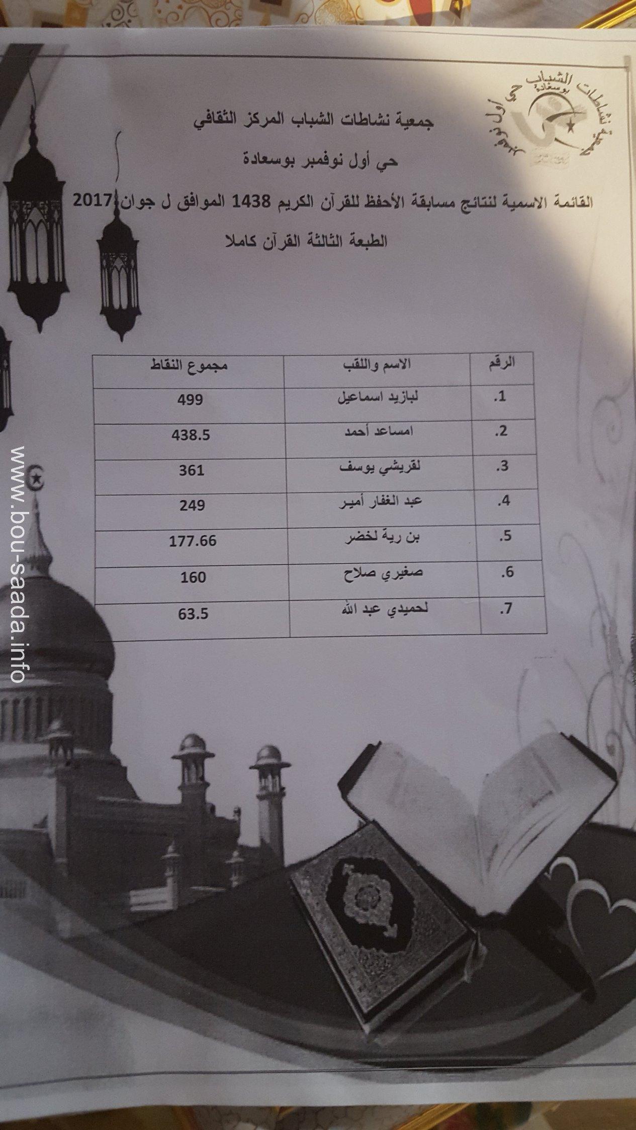 اختتمت سهرة امس الثلاثاء 25 رمضان 1438 الموافق ل 20جوان 2017 فعاليات الطبعة الثالثة لمسابقة الأحفظ للقرآن الكريم التي تنظمها جمعية نشاطات الشباب المركز الثقافي لحي اول نوفمبر