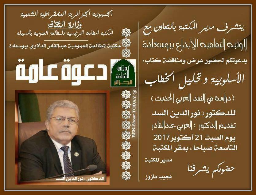 بالتنسيق مع الوثبة الثقافية نظمت ادارة المكتبة محاضرة للدكتوى نور الدين السد حول الاسلوبية وتحليل الخطاب وتقديم الدكتور العربي عبدالقادر بحضور دكاترة ومثقفين ونواب واعضاء من المجتمع المدني