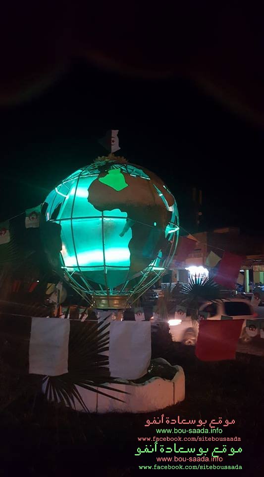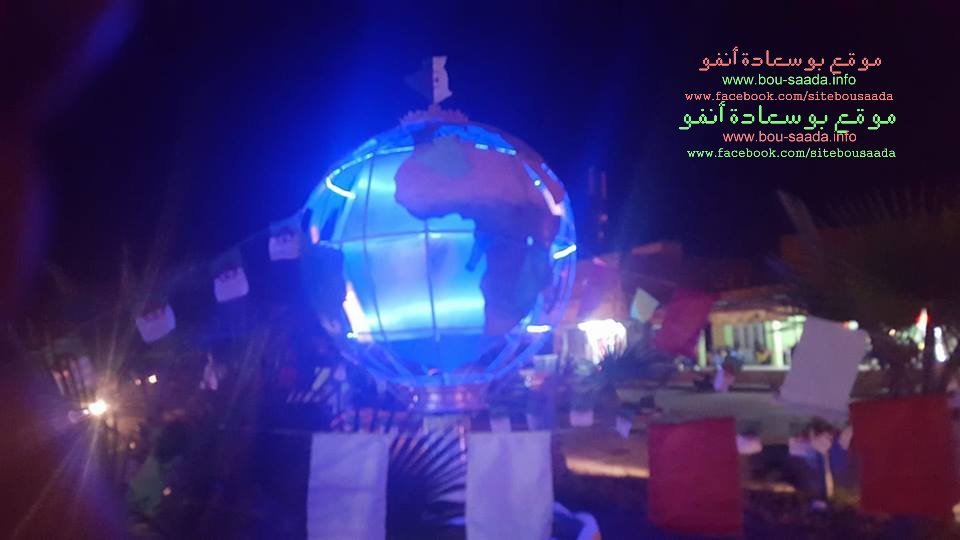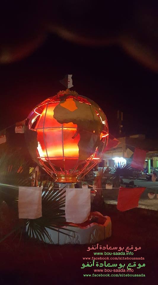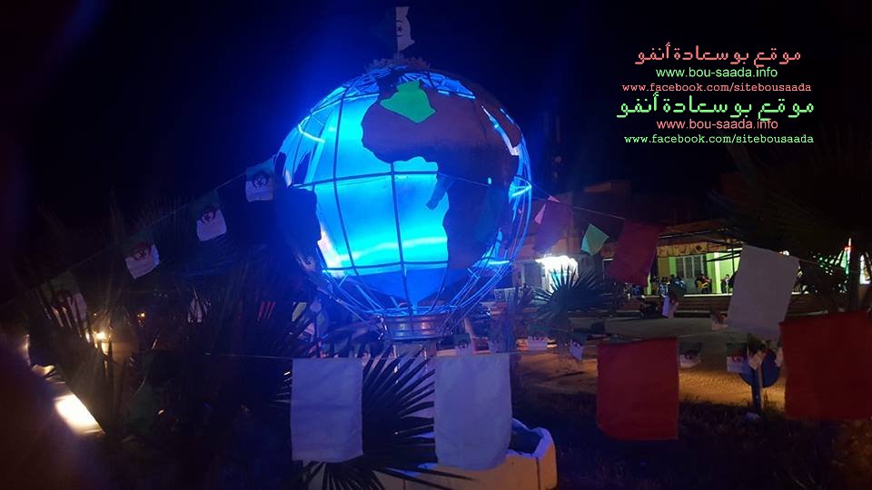 بمناسبة الذكرى 63 لاندلالاع الثورة التحريرية المباركة تم تدشين تحفة بشكل الكرة ألارضية قرب محطة نقل المسافرين بحي 20 أوت ببوسعادة بأضوائها المتنوعة الجميلة والتى تسر الناظرين في الليل واملنا أن تدعم هذه المجموعة بيد المساعدة لانجاز مشاريع سطرتها المجموعة لاعطاء صورة جميلة لحي 20 أوت